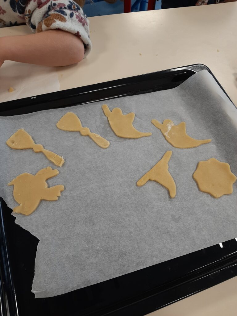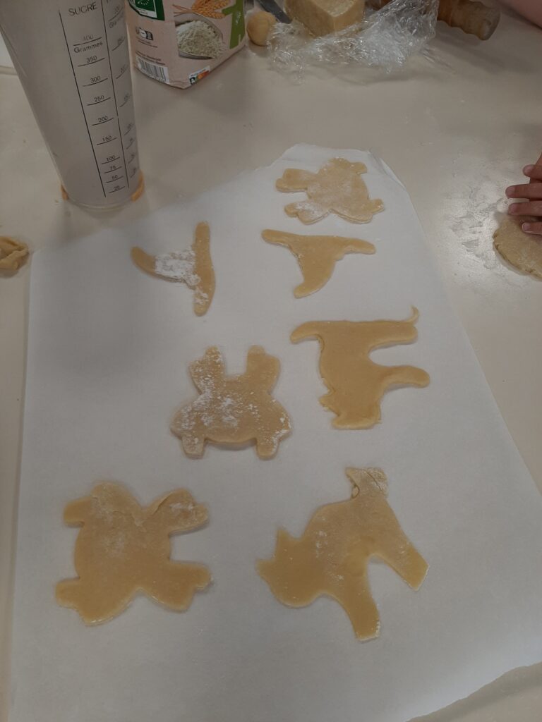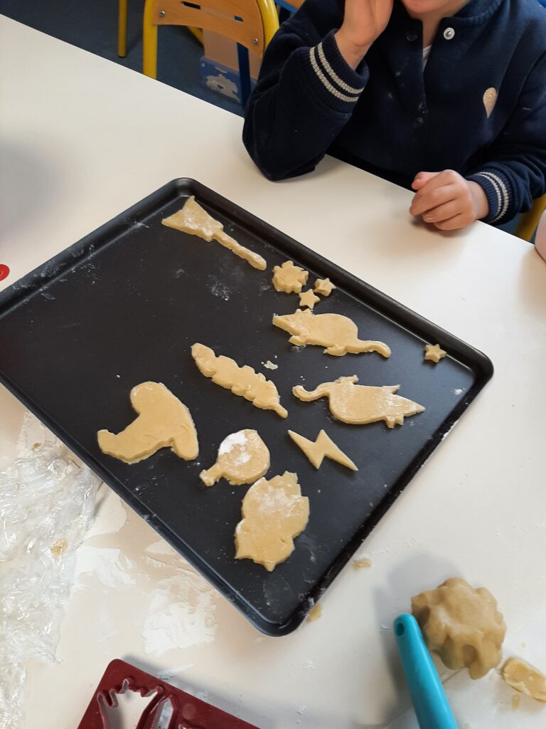 La maman d’Antoine avait préparé de la pâte pour gagner un peu de temps. Nous l’avons étalée, découpée à l’emporte-pièce et nous avons fait cuire nos sablés. Une douce odeur de vanille a envahi notre école.