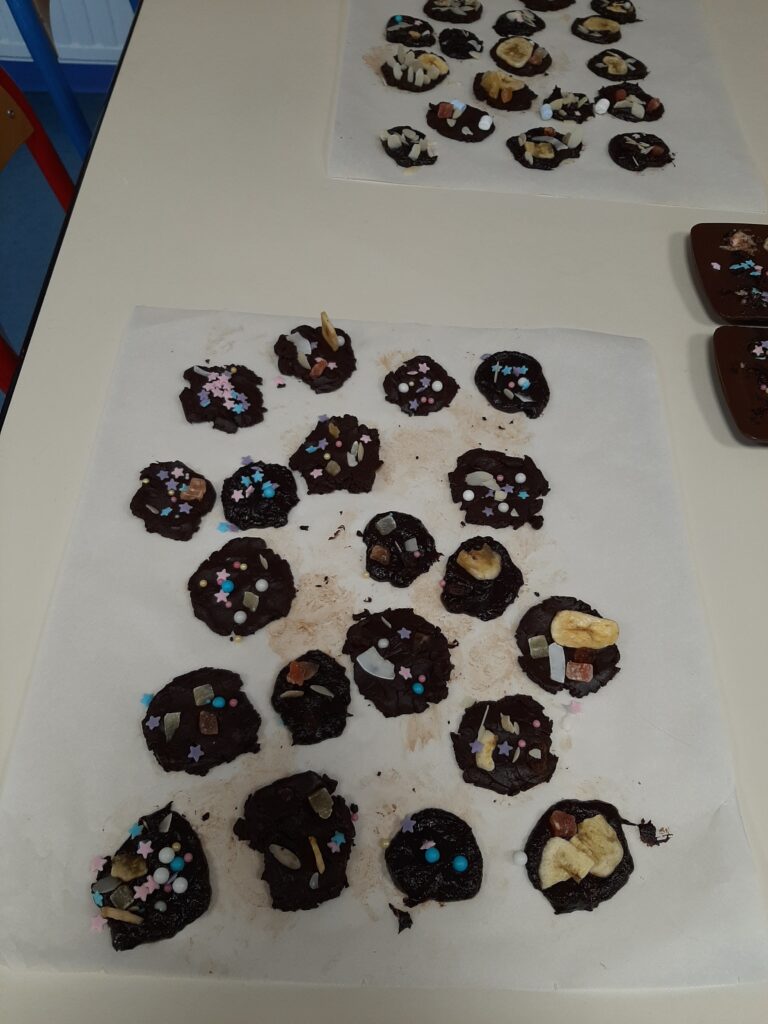 Nous avions à notre disposition tout un tas de petites décorations en sucre et des fruits secs. Nous nous sommes aperçus que travailler le chocolat n’était pas si facile, mais le résultat était très satisfaisant pour une première fois.