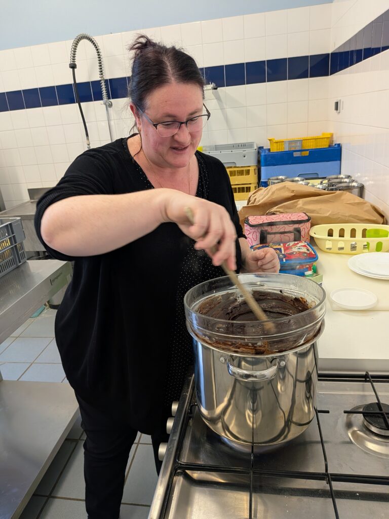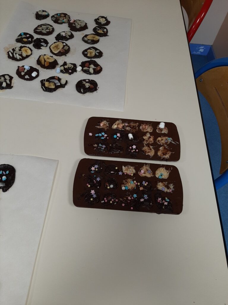 Nous avons commencé par faire fondre le chocolat au bain-marie. Ensuite, nous nous sommes réparti les ateliers :