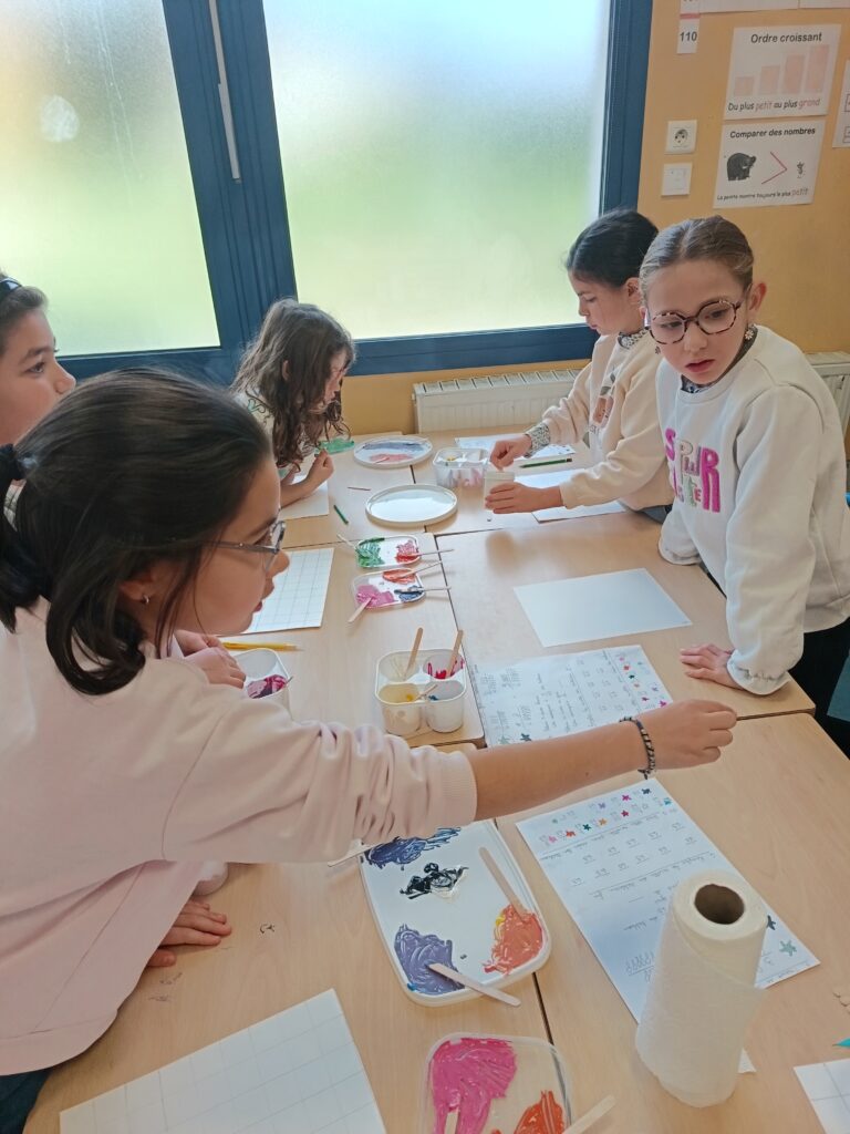 Afin de travailler les fractions ➗, les élèves de CM1 ont suivi une fiche recette leur permettant de créer une nouvelle palette de couleurs 🎨 à partir des trois couleurs primaires, ainsi que du noir et du blanc.