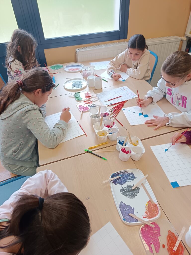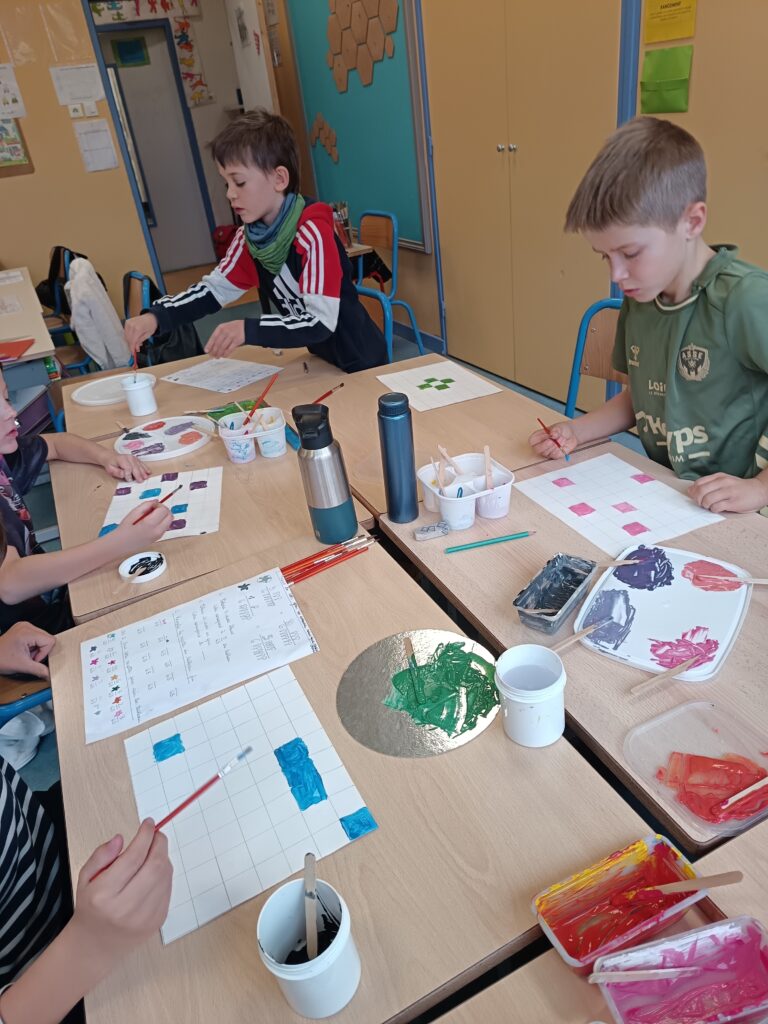 Une fois leurs mélanges réalisés, ils ont rempli les 63 cases de leur quadrillage en indiquant, pour chacune, les fractions correspondant aux couleurs utilisées dans leur œuvre 🖼️.
